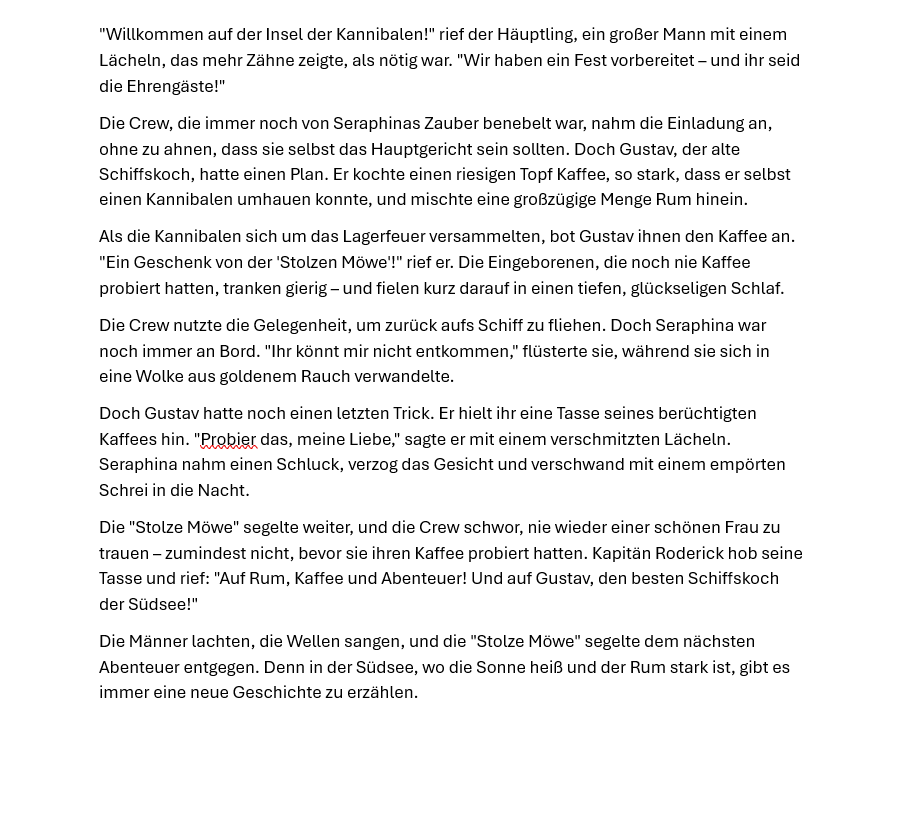 Die "Stolze Möwe" segelte weiter, und die Crew schwor, nie wieder einer schönen Frau zu trauen – zumindest nicht, bevor sie ihren Kaffee probiert hatten. Kapitän Roderick hob seine Tasse und rief: "Auf Rum, Kaffee und Abenteuer! Und auf Gustav, den besten Schiffskoch der Südsee!"